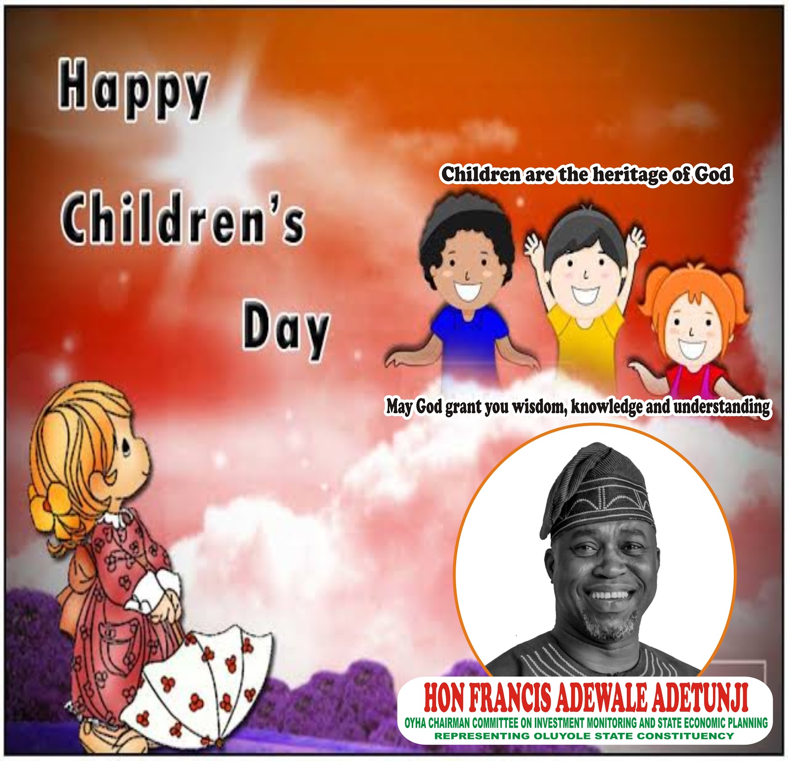 Hon Francis Adewale Adetunji, Oyo state house of Assembly chairman committee on Investment Monitoring and State Economic Planning, representing Oluyole state constituency celebrates the children in his statement quoted below;