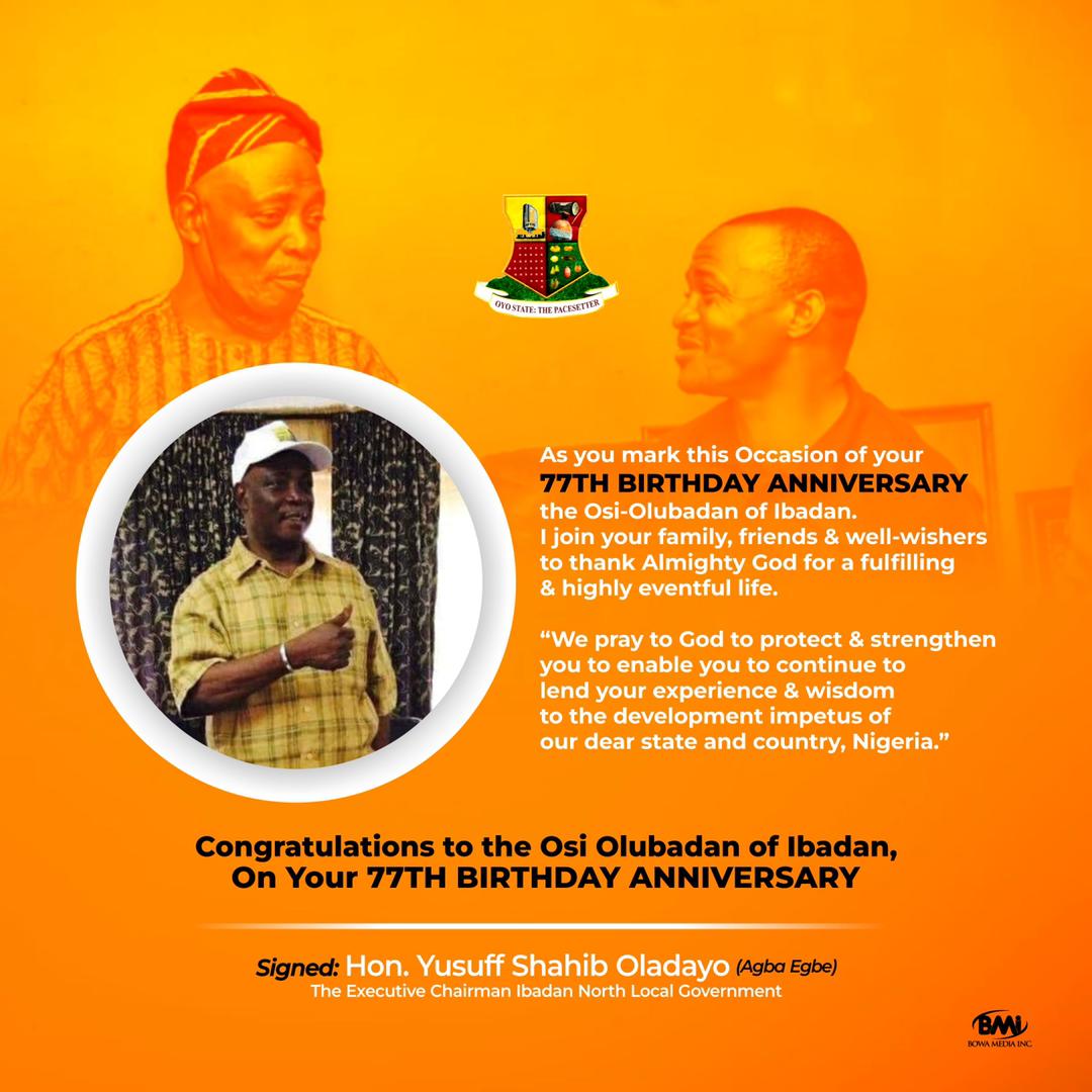As you mark this Occasion of your 77th birthday anniversary, the Osi-Olubadan of Ibadan. I join your family, friends and well-wishers to thank Almighty God for a fulfilling and highly eventful life.
